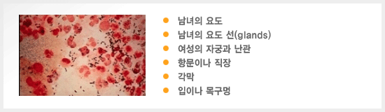 임질균은 생식기의 따뜻하고 습한 부위에서 잘 자라 다음의 부위에 감염됩니다. |